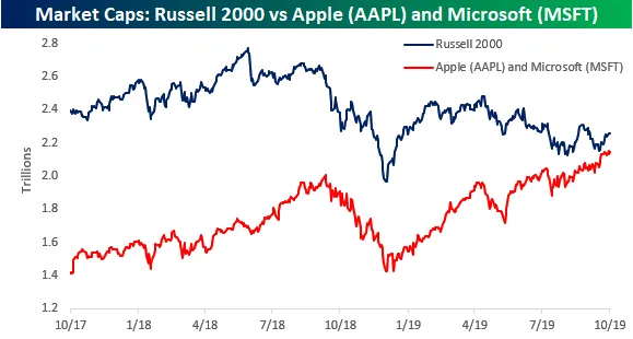 两件事让我想到了这些。第一件是全球范围内的抗议活动,尤其是在智利。这些抗议活动主要是由不平等引发的,正如我昨天所写,并且表明对不平等的不满正在达到顶点。第二件是一个显著的统计数据,即仅有两家公司,永恒的科技竞争对手苹果公司和微软公司,现在的市值几乎与整个小型公司Russell 2000指数相当。以前并非如此。以下图表来自Bespoke Investment Group: