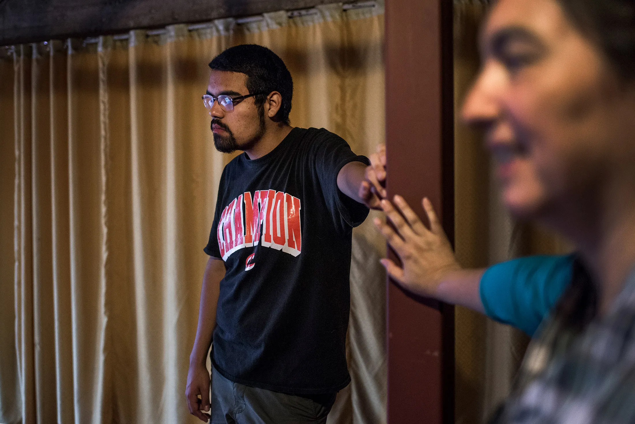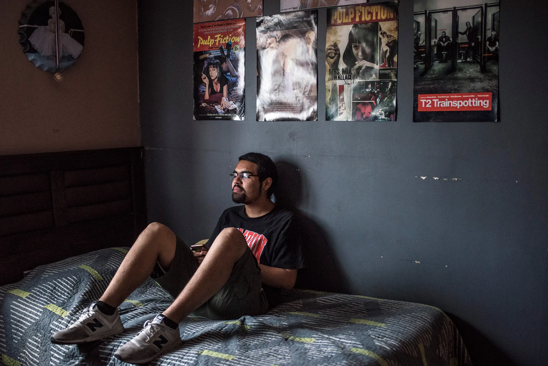 Camilo Quiroz坐在他的卧室里,墙壁是木头和聚苯乙烯泡沫,观看他的妹妹在他的笔记本电脑上玩游戏,并清理他破裂的眼镜。