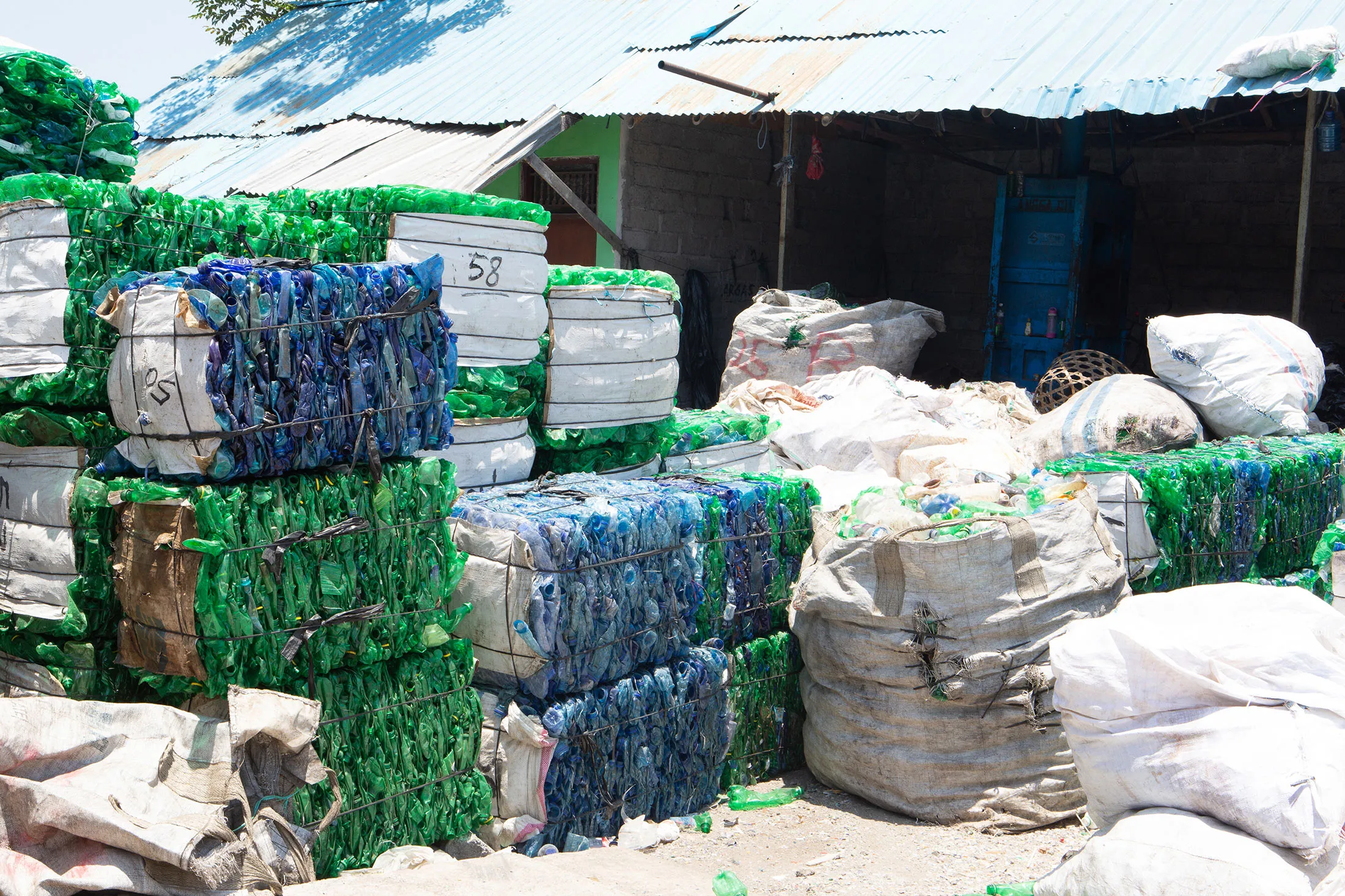 在塑料银行合作伙伴巴厘岛PET回收公司打包的塑料。