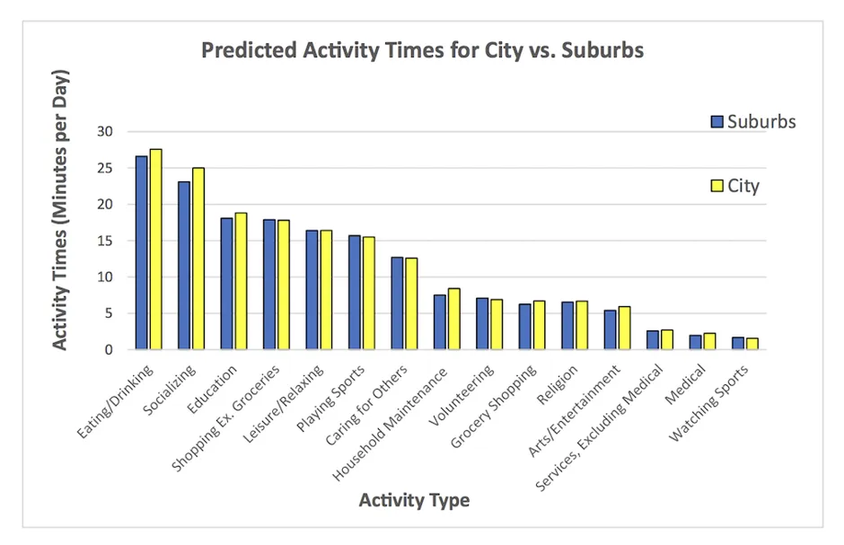 即使在城市和郊区居民花费时间的方式上存在差异,这些差异往往也相当小。例如,尽管城市居民稍微更可能外出,但根据研究模型,这仅转化为每天比郊区居民多出大约三分钟的外出时间。城市居民社交的时间多出两分钟。他们在杂货购物和参与艺术文化活动上多花大约半分钟。