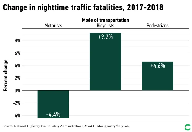 道路死亡人数也在一天中的不同时间段发生变化。根据NHTSA在2017年至2018年间的调查,夜间死亡人数(该机构将其定义为晚上6点到早上6点之间)对行人的死亡率上升了4.6%,对骑自行车者的死亡率上升了9.2%。这与长期趋势一致:根据州长公路安全协会在2月份发布的一份报告,夜间事故占2007年至2017年间行人死亡总增加的90%以上。州长公路安全协会。