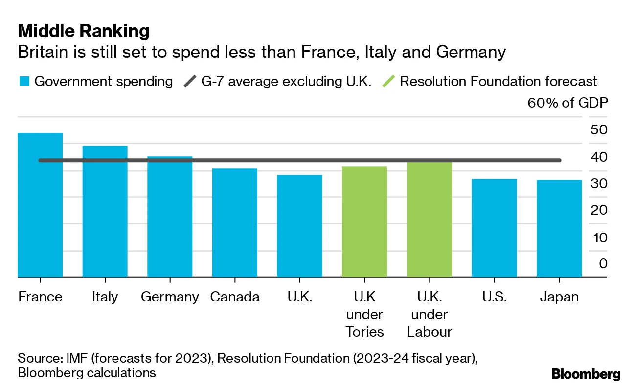 - 英国可能正朝着1970年代风格的政府支出水平迈进,但负担仍将低于法国、意大利和德国。根据解决基金会的预测,如果工党赢得选举,到2023年,英国的公共支出可能占经济产出的43.3%。这略低于G-7其他国家的平均水平,正如国际货币基金组织所预测的。