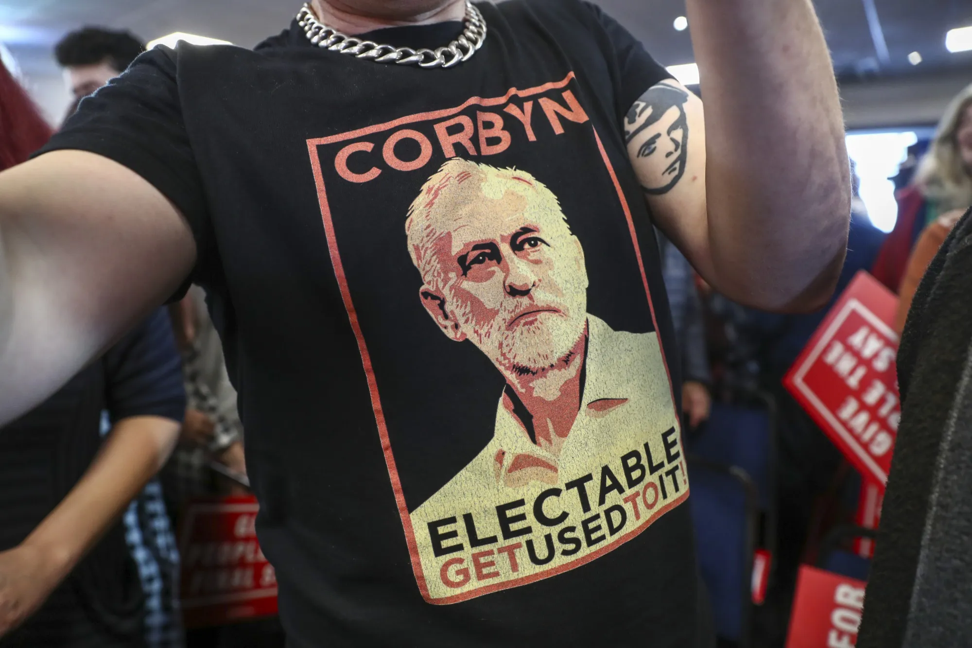 2019年11月5日,工党领袖杰里米·科尔宾在英国哈洛出席关于脱欧的演讲时,一名与会者穿着印有科尔宾图像的T恤。如果下个月的英国选举没有任何政党获得绝对多数,科尔宾可能会因获得苏格兰民族党的支持而掌权。摄影师:西蒙·道森/彭博社摄影师:西蒙·道森/彭博社