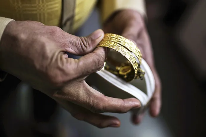 一位顾客在印度孟买的家中申请Rupeek Fintech Pvt.的黄金贷款时,手中拿着金手镯,时间是2019年9月18日,星期三。Rupeek得到了硅谷两家最强大的风险投资公司Sequoia Capital和Accel的支持,允许人们以他们的黄金储备借钱,这些储备通常是从婚礼礼物或家族继承而来的。摄影师:Dhiraj Singh/Bloomberg印度人如此热爱黄金,以至于他们在家中藏有估计价值1万亿美元的黄金。但有时他们需要额外的现金,在银行或当铺进行交易可能会让人感到尴尬。现在有了一个应用程序,贷款代理通过上门取金来保持隐私。