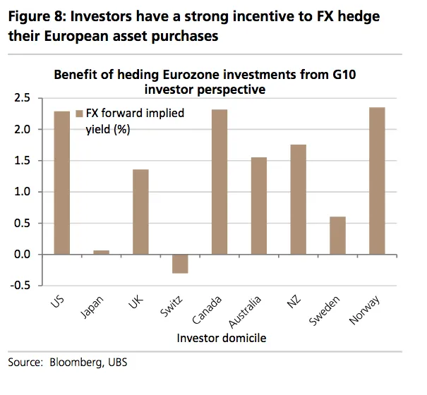 这种对以欧元发行的需求增加并没有导致对欧元的更多需求。然而,瑞银集团分析师得出结论,外国资金流入欧洲债务可能已经进行了对冲,以提高收益率。“外汇对冲债券流入的作用可以解释为什么投资组合投资余额的改善没有推动欧元,”他们总结道。