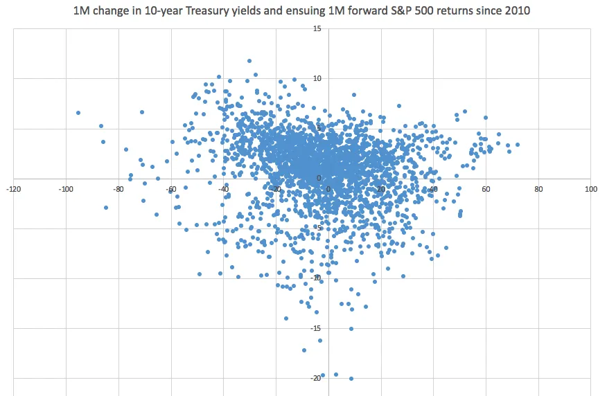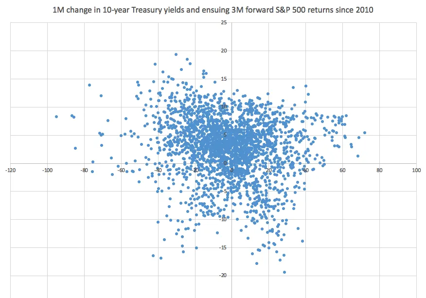 这是自2010年以来10年期收益率的21天变化及随后21天美国股票的回报情况。