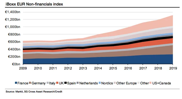根据法兴银行的数据,美国企业债务是iBoxx EUR非金融指数的第二大组成部分,仅次于法国的未偿债务。而且它有望在未来18个月内超过法国债务。