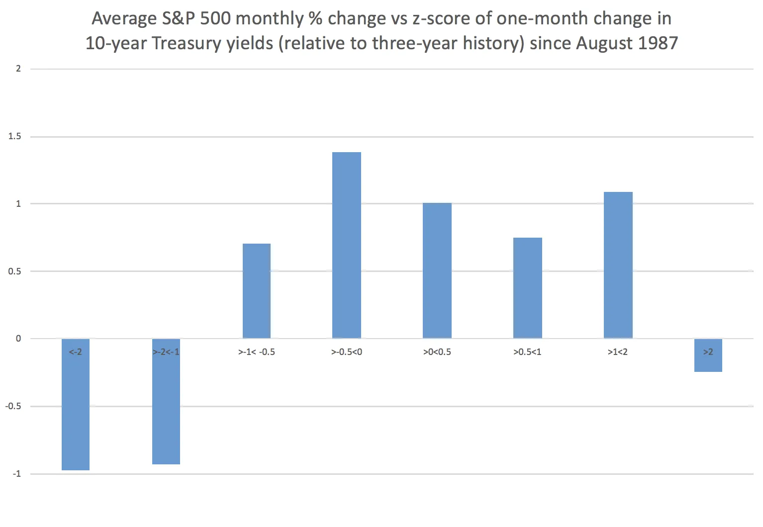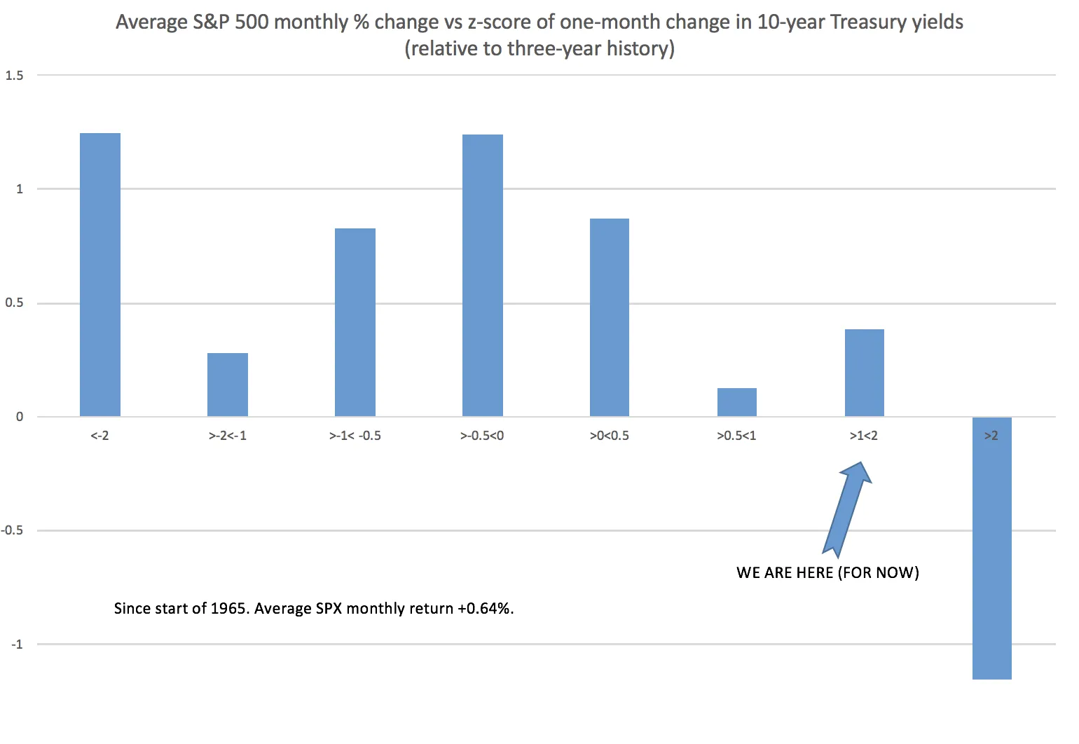 更广泛的历史视角也讲述了同样的故事。回溯到1965年,计算10年期收益率相对于其三年历史的月度波动的z-score,以及同期的股票回报,显示出快速上升的收益率是股市最糟糕的自然状态。