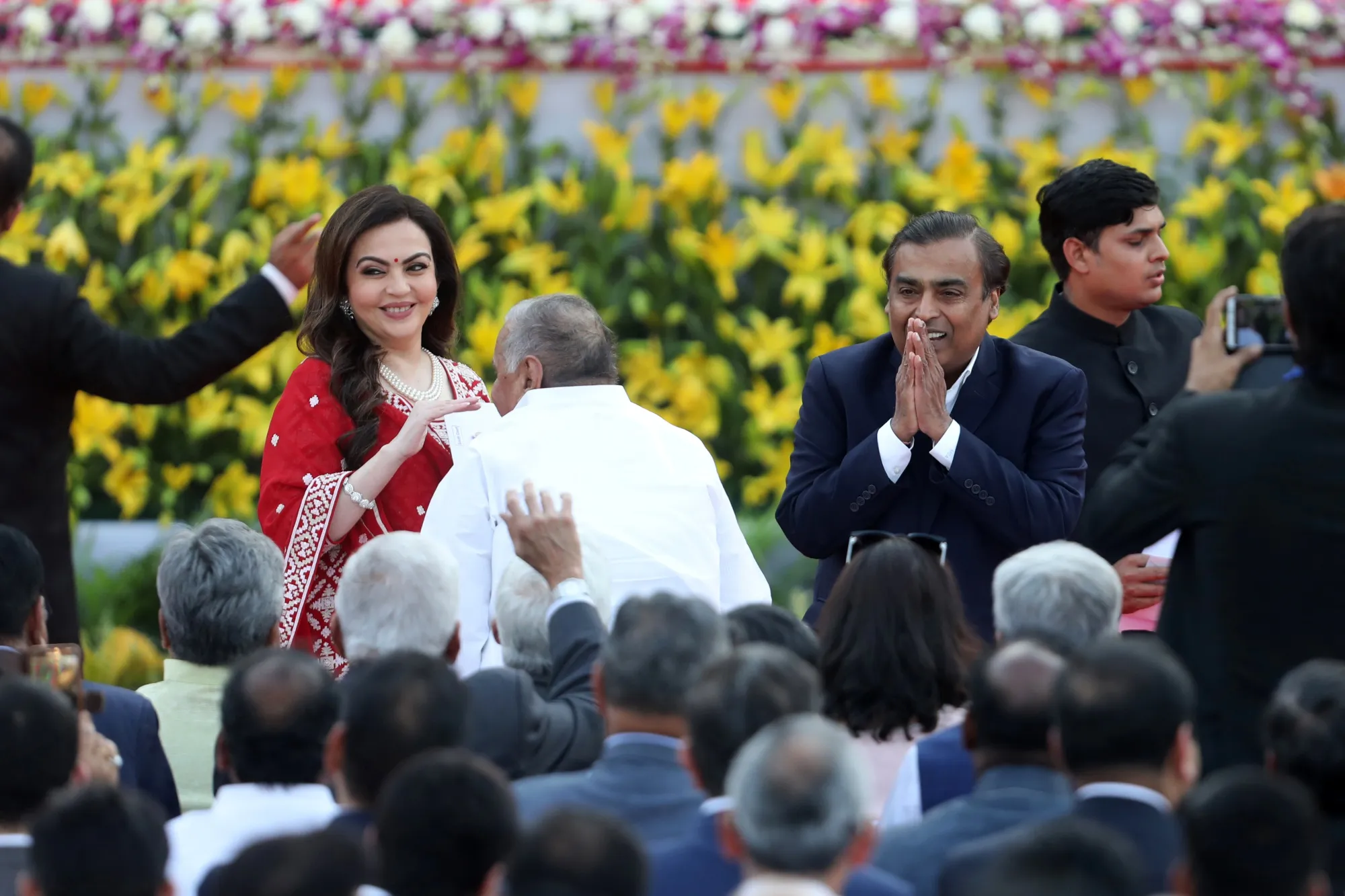 穆凯什·安巴尼,信实工业有限公司的董事长兼总经理,右中间,与他的妻子尼塔·安巴尼在2019年5月30日星期四,在印度新德里的总统府参加总理及其他内阁成员的宣誓仪式时,向其他与会者致意。莫迪在印度选举中取得的压倒性胜利,使执政的印度人民党在543个议席的议会中赢得303个席位,给予他单一政党的多数席位,并提高了他在第一任期内未能进行改革的期望。摄影师:T. Narayan/彭博社摄影师:T. Narayan/彭博社