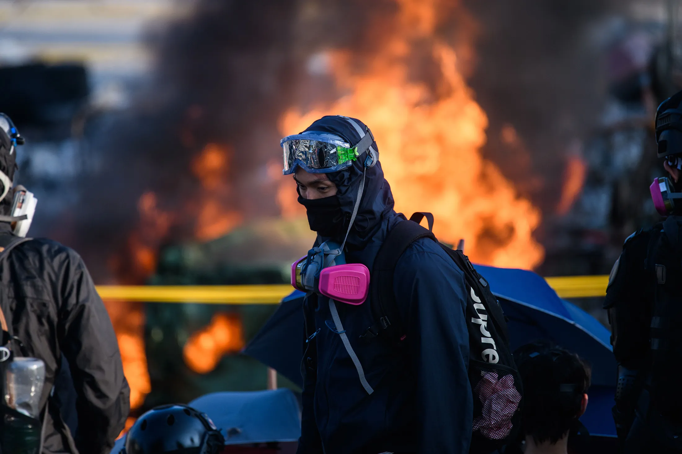 抗议者在2019年11月13日早晨于香港中文大学(CUHK)前面站在燃烧的路障旁。- 香港的民主抗议者与防暴警察在大学校园内展开激烈战斗,并在周二瘫痪了城市的高档商业区,延续了超过五个月政治混乱中最暴力的抗议阶段之一。(照片由安东尼·华莱士/法新社提供)(照片由安东尼·华莱士/法新社通过Getty Images提供)摄影师:安东尼·华莱士/法新社摄影师:安东尼·华莱士/法新社