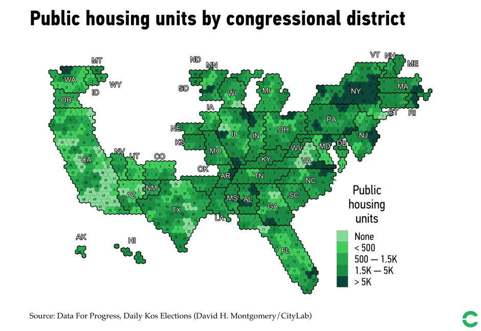 AOC–桑德斯法案还将公共住房作为一个目标。该法案的一项条款将废除 费尔克劳斯修正案,这是一个限制新公共住房单位建设的联邦规则。进步数据公司概述了 一个进步住房议程的愿景,该愿景在很大程度上依赖于公共住房和其他当前联邦法律(以及联邦资金水平)使其困难或不可能实现的目标。人民行动,一个基层组织,推出了一个名为 住房保障的政策平台,概述了许多相同的目标。
