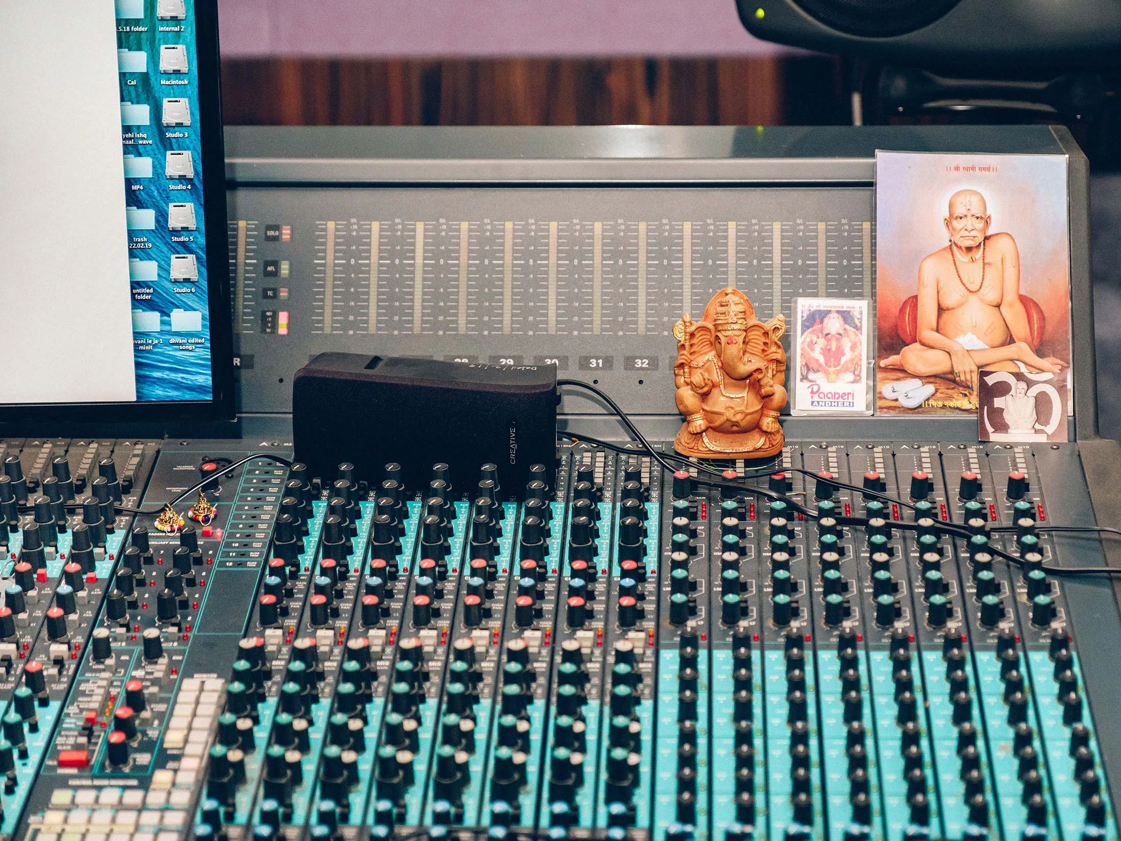宗教符号装饰着库马尔在孟买的一次录音室听音会上的设备。摄影师:Mahesh Shantaram为《彭博商业周刊》拍摄对于库马尔来说,互联网巨头的新兴趣既是威胁也是机会。凭借更大的预算和无尽的技术资产,外国公司可能对印度制作人构成严重挑战,吸走人才和观众,同时威胁到支撑他成功的宝莱坞热门工厂。或者,他们也可能是有价值的合作伙伴,渴望获得只有像T-Series这样的公司才能提供的印度市场的深入知识。