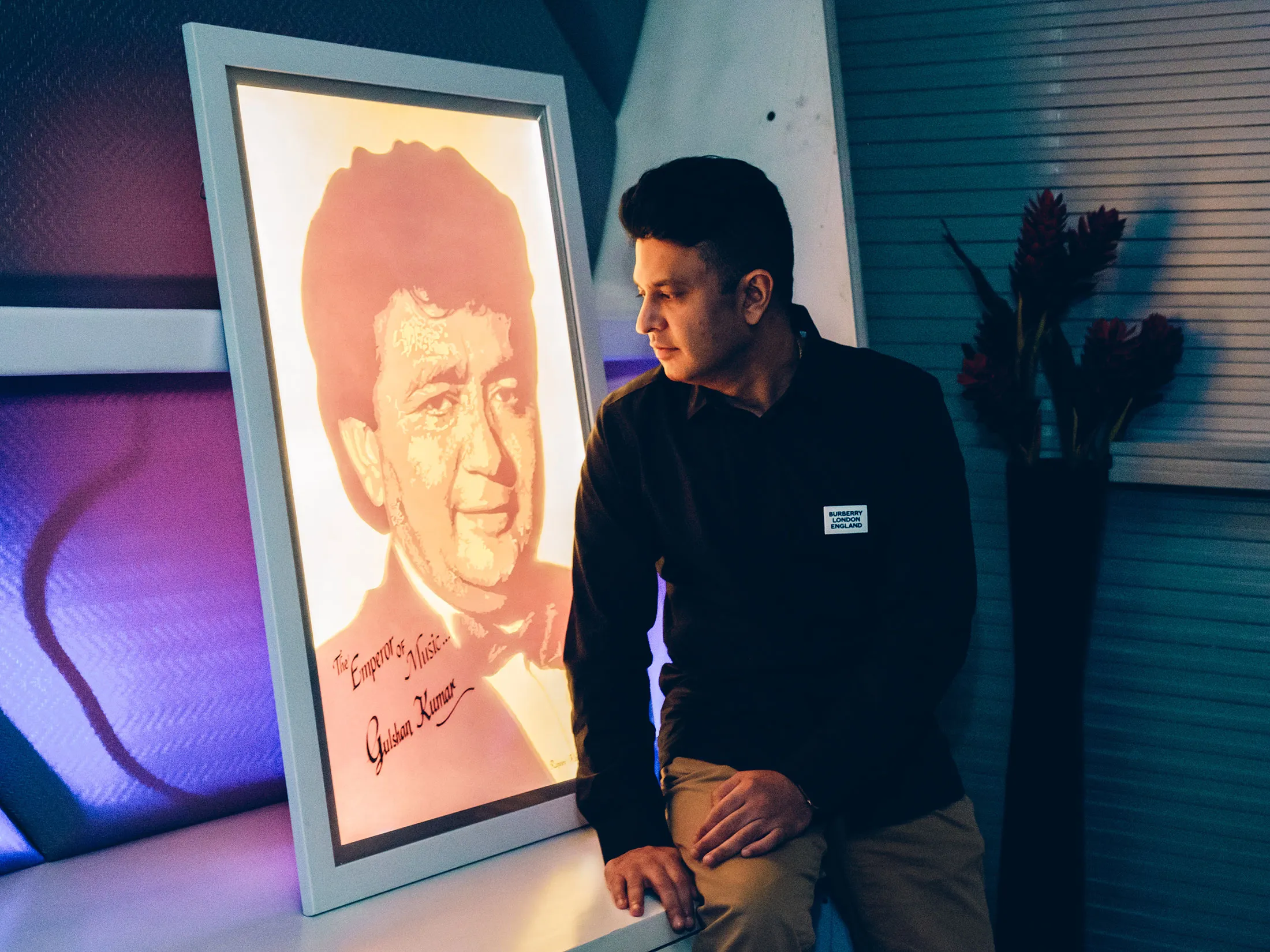库马尔与他已故父亲的肖像。摄影师:马赫什·尚塔拉姆为《彭博商业周刊》拍摄古尔尚为这个行业带来了颠覆者的敏感性,以深度折扣提供磁带,并通过便利店和街角摊位进行分销。他委托制作旁遮普语和博杰普尔语等地区语言的专辑,挖掘竞争对手认为过于小或分散的市场。在此过程中,他因在保护印度最受欢迎歌曲的版权方面玩弄手法而声名鹊起,这些歌曲来自于印地语电影的“马萨拉音乐剧”——动作、喜剧和浪漫的混合体。T-Series否认古尔尚曾参与明显的盗版行为,但并不否认他利用了允许热门歌曲翻唱的版权漏洞。