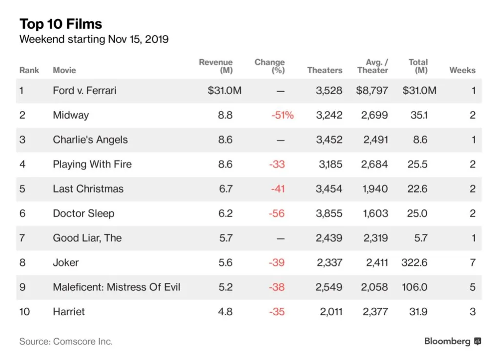 全球第一部电影是“福特对法拉利”。关于两家汽车制造商之间竞争的戏剧在北美这个周末收入3100万美元,海外又收入2100万美元。