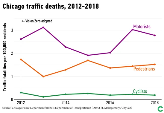 第一个“设想零”城市并不是第一个落实这一设想的城市。芝加哥市直到2012年首次宣布其意图后五年才制定出消除交通伤亡的行动计划。尽管芝加哥警察局有多年来的事故总数,但该市直到2017年才开始收集详细的死亡和伤害数据,这意味着关于其进展的信息远不如许多其他大型“零愿景”城市丰富。(这也使得CityLab无法创建其交通伤亡的可比地图。)
