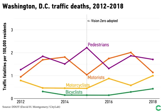在2015年底,华盛顿特区发布了一项有前景的行动计划,旨在到2024年消除交通伤亡。根据当时该市相对较低的交通死亡人数,这一目标似乎“完全在可及范围内”,根据一篇 CityLab 发表的文章。