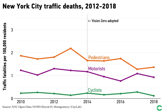 在纽约市的政策变化中:新增82英里的保护自行车道,数千个行人友好的交通信号灯,提高对危险驾驶者的处罚,说服州立法者降低速度限制,学校内的速度执法摄像头,以及其他街道安全升级——其中许多最初作为油漆试点项目开始。