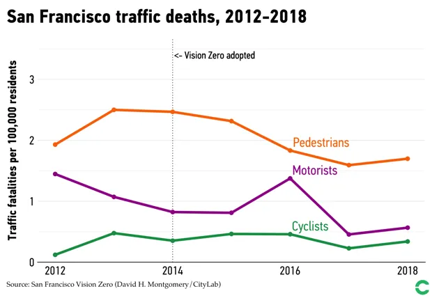 在实现到2024年消除街头死亡的10年目标的中途,“以交通为先”的旧金山取得了一些令人鼓舞的进展。尽管道路上的汽车交通增加,但2013年至2018年间,整体死亡人数有所下降,尤其是行人。与此同时,骑自行车的死亡人数基本持平。