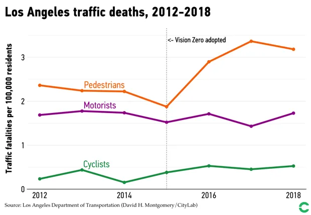 在2015年,洛杉矶市市长埃里克·加塞提签署了一项行政指令,呼吁市政府部门追求到2025年消除交通死亡的目标。但其努力并没有导致死亡人数减少:自从该市启动零死亡政策以来,致命车祸增加了超过30%。正如L.A.时报今年早些时候报道,自2015年以来,洛杉矶因交通碰撞而死亡的人数超过了被枪杀的人数。而且,行人受到的影响最大,2015年至2018年间,行人死亡人数惊人地增加了75%。
