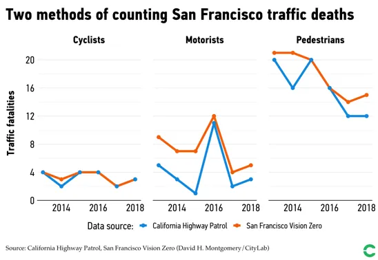 根据旧金山交通管理局发言人的说法,导致差异的一些可能原因包括一些方法论上的差异,例如骑自行车者死亡但没有机动车辆参与的事故;旧金山将其视为“交通死亡”,但加州公路巡警的数据不包括此类事故。