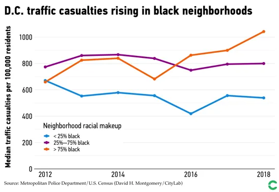 也许过于自信阻碍了该市将其承诺付诸实际行动。在随后的四年中,该市从未制定正式的交通愿景总体规划,几次尝试重新设计街道以确保安全通行都因社区团体的反对或交通官员的简单惰性而受阻。直到最近,市长穆里尔·鲍泽才任命了一个适当的工作组来负责实现该市的目标——在该市的“零交通死亡”宣言后,交通死亡人数开始上升。2018年,华盛顿特区的街道上有36人遇难,是十年来最糟糕的一年。而自2014年以来,死亡人数和受伤人数的增长主要发生在以黑人社区为主的地区,如下图所示。