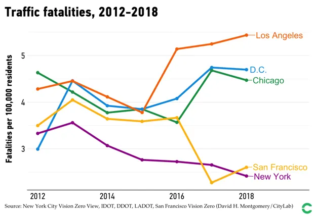 根据CityLab对五个主要城市交通死亡率的分析,这种模式在几个身披“零愿景”外衣的城市中得以体现,这些城市是美国最早设定“零愿景”目标的城市之一。三座城市,芝加哥、洛杉矶和华盛顿特区,死亡人数上升或保持相对平稳。另两座城市,旧金山和纽约市,朝着零目标取得了一定进展,但最近行人和骑自行车者的死亡人数却有所上升。