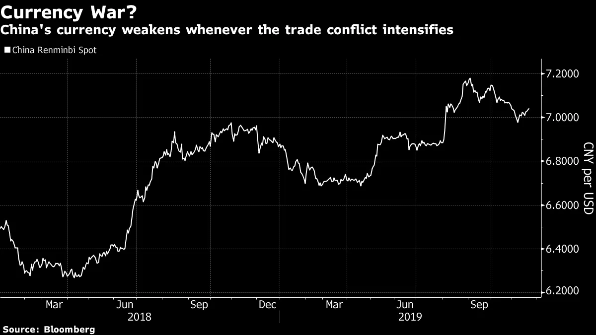 与此同时,中国在谈判中拥有的权力比最初显现的要多。首先,注意人民币在特朗普任内的走势。它仍然是一种主要受管控的货币,中国在贸易紧张局势上升时允许其贬值。最近几天,人民币再次突破了7对美元的关口,这并非巧合。