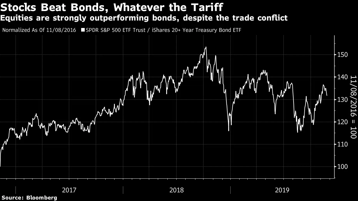 从资产配置的更广泛轮廓来看,将贸易冲突的兴奋与股票和债券之间的变动进行映射也出乎意料地困难。这在这张各资产类别最显著交易所交易基金的相对表现图表中得到了说明。股票的大幅抛售发生在去年的布宜诺斯艾利斯峰会之后,当时似乎降低了贸易的紧张气氛。尽管缺乏任何明确的进展,过去几周的恢复仍然发生了: