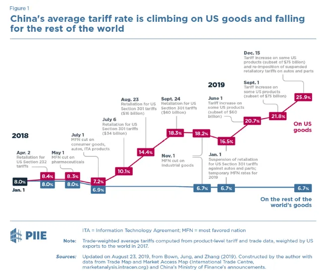 这直接帮助了其他国家在与美国竞争时的竞争力。与此同时,这张克罗伯借自彼得森国际经济研究所的图表显示,尽管中国对美国进行了报复,但实际上正在降低对其他国家的关税: