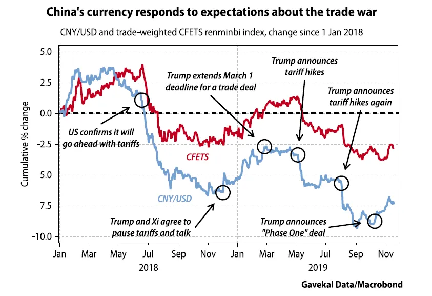 为了明确这些走势与关税争端的紧密关系,克罗伯提供了以下注释图表,显示自去年年初冲突开始以来,中国货币对美元及按贸易加权的表现。请注意,它并没有允许人民币对其他货币贬值到如此程度: