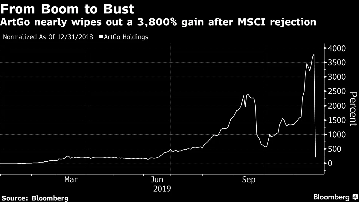 但有趣的是,基准指数提供商可能会拒绝这个标签。他们常常将自己的角色描述为仅仅是通过向市场展示一面镜子来反映投资者的需求和愿望。显然,问题在于,他们的决定可能会最终影响到那个市场。关于这种动态的最新实例,请查看我同事Jeanny Yu和Kiuyan Wong的这篇报道。它讲述了一家名为ArtGo Holdings的石材公司,其股票今年上涨了约3800%——促使MSCI宣布其将把该股票纳入其指数。但在周四,MSCI突然取消了这些计划,理由是对该股票的“可投资性”表示担忧。股票随即暴跌98%。