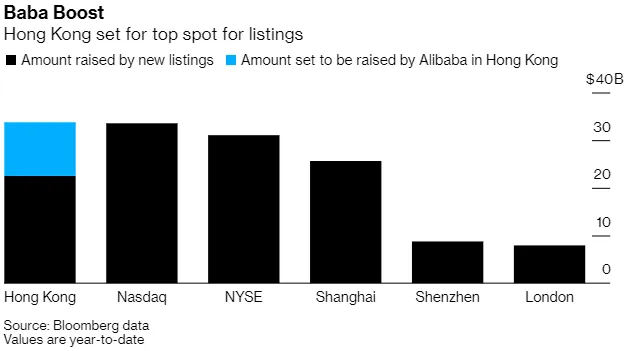 在香港经历了近半年的动荡后,阿里巴巴本周仍然推进了一项巨大的股份出售。这家中国电子商务巨头在香港的 最大上市 中筹集了约 110亿美元,这是自2010年以来的最大规模。这可能使阿里巴巴的现金储备增至440亿美元,约为中国科技巨头腾讯的两倍。这笔资金可能用于投资以扩大公司在东南亚的业务,或加强其在人工智能等技术方面的努力。