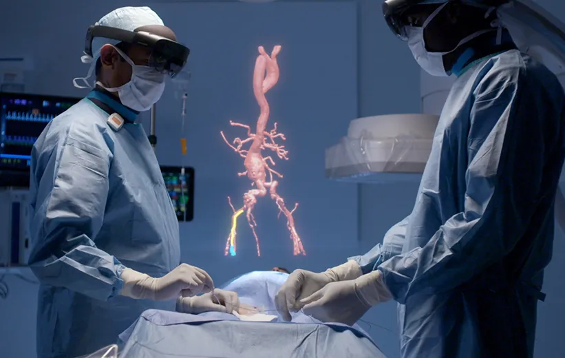 **3. 微软将增强现实送入急救室。**HoloLens 2耳机将患者器官的图像叠加到现实视图中,为外科医生提供了一种新工具。