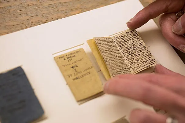 九本迷你手稿书,其中六本由夏洛蒂·勃朗特创作,三本由帕特里克·布兰威尔·勃朗特创作,属于哈佛大学霍顿图书馆的收藏。这些书描绘了通过绘画、故事和诗歌创造的虚构世界。它们涉及玻璃城邦联盟和安格里亚的幻想世界。这些手稿是在夏洛蒂十三岁和布兰威尔十二岁时写的。斯蒂芬妮·米切尔/哈佛大学工作人员摄影师现在你心情更好了……告诉你的朋友们 注册 以每周五天接收我们的新闻通讯,并在 推特、 优酷、 Instagram 和 脸书。