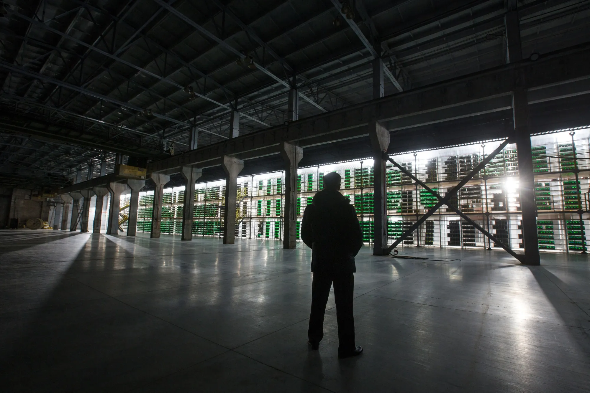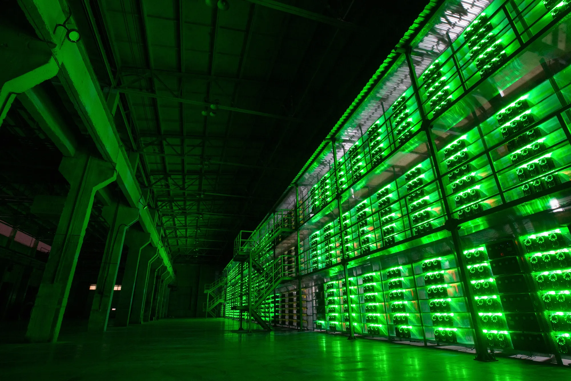 照明的加密货币挖矿设备在这座庞大的建筑内延绵不绝。