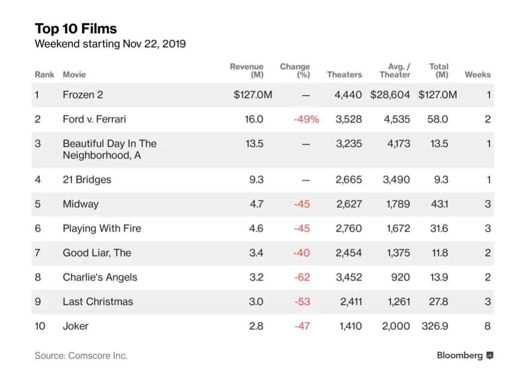 全球票房最高的电影是“冰雪奇缘 II”。这部电影在北美的票房为 1.27亿美元,并在全球获得了3.5亿美元的票房。