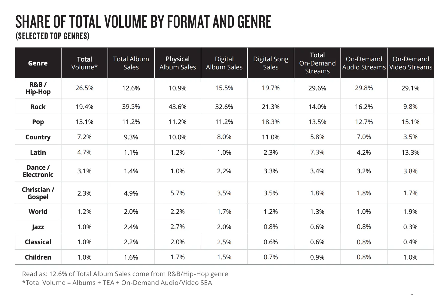 这种差异主要是由于人口统计因素。流媒体首先在城市中心和沿海地区流行,那里的嘻哈和流行音乐占主导地位。流媒体也首先在年轻用户中流行,他们更喜欢听嘻哈和电子音乐。举例来说:R&B和嘻哈在上半年仅占专辑销售的12%,但几乎占流媒体的30%。