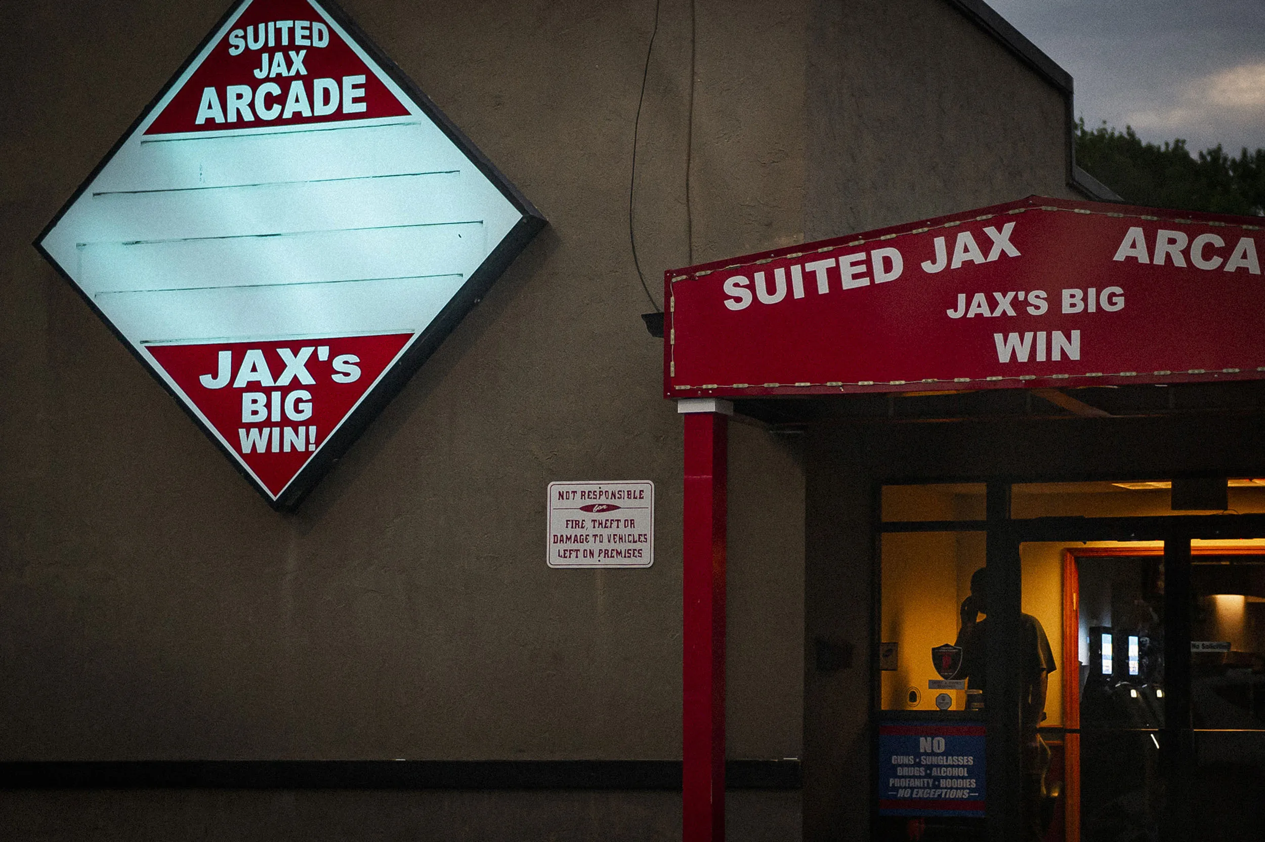 在一个星期二晚上大约9点,我向Suited Jax Arcade的收银员递上了三张20美元的钞票和我的驾照。Suited Jax位于城市的西南侧,其主房间大约有一所小学体育馆的大小。收银员为我设置了一个带有数字ID和密码的账户;几分钟后,我坐在一台桌面电脑前——旁边还有大约40人正在尝试运气,玩着名为梅林的财富、中世纪财富和拉斯维加斯王牌等各种老虎机风格的游戏。