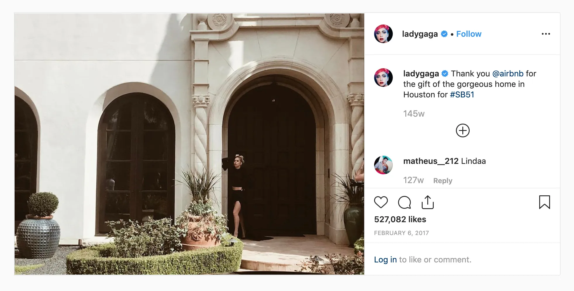 女神嘎嘎也类似地编辑了她的超级碗原始帖子,以澄清Airbnb的房子是“礼物”。在记者询问碧昂丝的超级碗帖子是否为赞助后,她最终删除了该帖子。