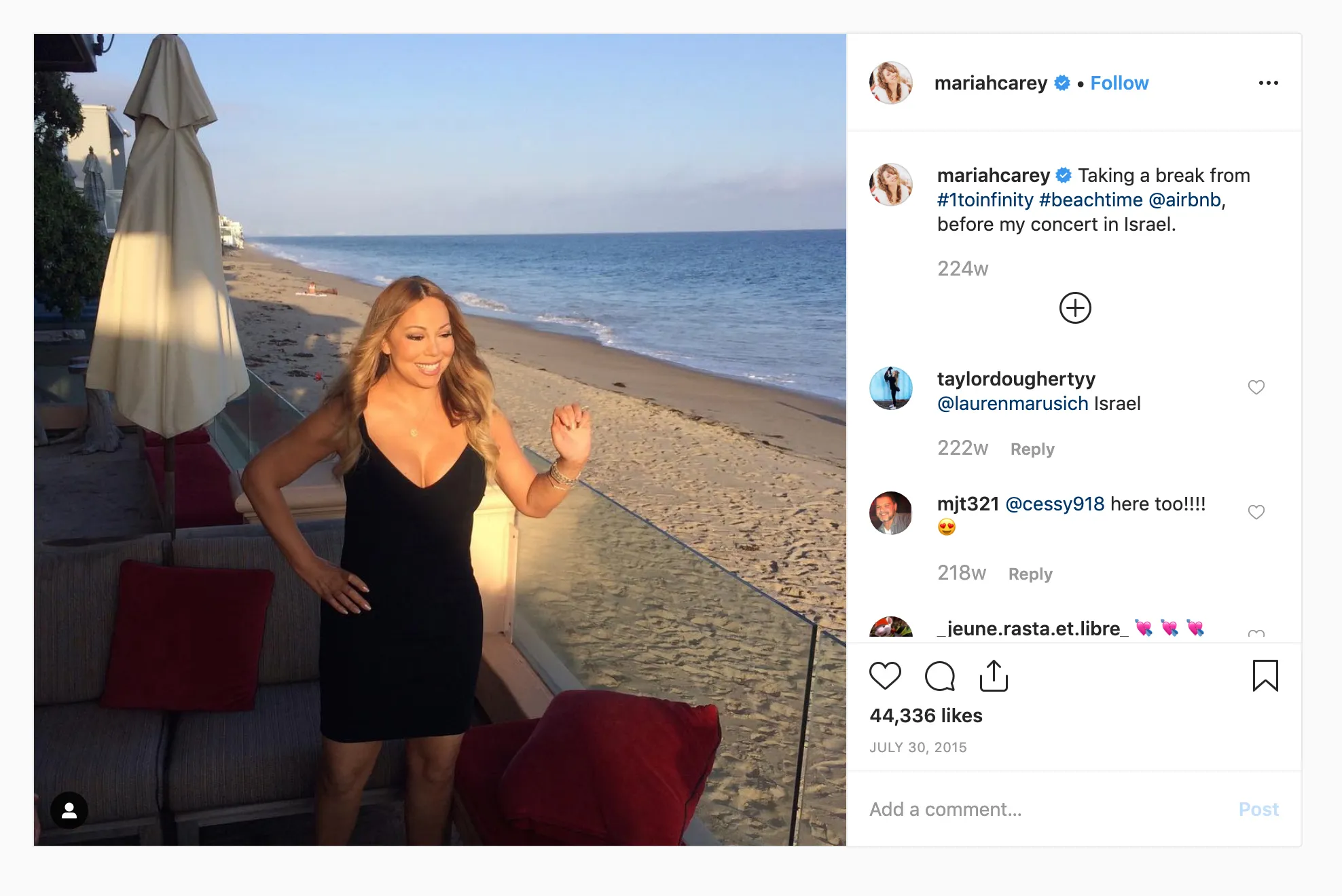 玛丽亚·凯莉和杰夫·比彻在2015年。摄影师:迈克尔·科瓦克/Wireimage在2015年夏天的一个星期里,消费名人八卦新闻的消费者无法逃避玛丽亚·凯莉前往加利福尼亚州马里布的旅行。她在那里的Airbnb住宿,她在Instagram上记录的内容,让头条新闻的撰写者们为之倾倒。它被报道在 TMZ (“玛丽亚·凯莉:我使用了Airbnb……为了我生病的马里布租房”), Page Six (“深入了解玛丽亚·凯莉每晚1万美元的Airbnb租房”) 和 PopSugar (“玛丽亚·凯莉每晚10,000美元的Airbnb是终极幻想,”以及幻灯片放映)。