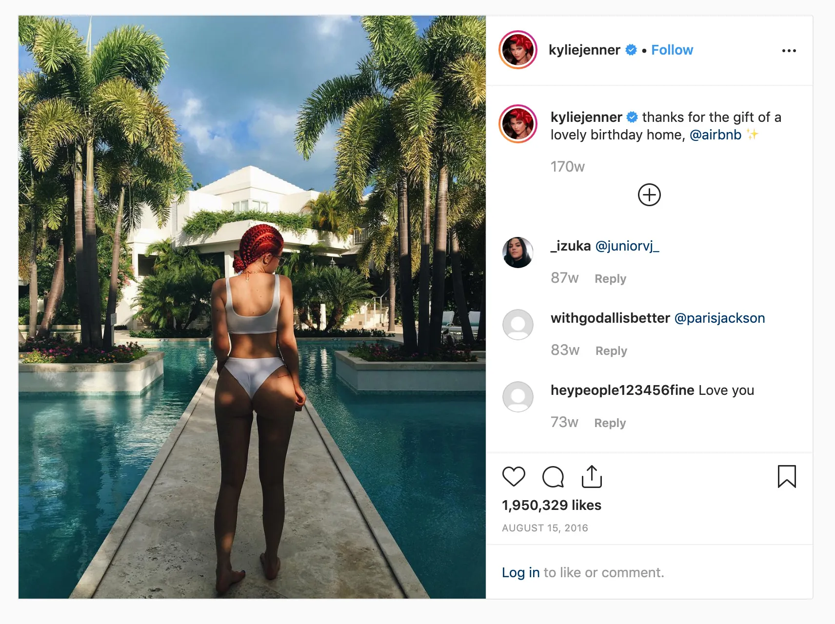 尽管如此,特别是在早期,一些名人关于他们Airbnb的帖子占据了一个灰色地带。2016年,正值FTC 加强对赞助帖的执法之际,消费者倡导组织“广告真实”向卡戴珊和詹娜家族的成员发送了一封信,抱怨“众多帖子”关于鞋子、食物和其他产品,并未明确披露商业关系,这促使该家族修订了许多帖子。在其中一条中,凯莉·詹娜身着白色泳衣,优雅地站在阳光普照的泳池上,文本从“感谢生日之家,@airbnb”改为:“感谢你赠送的美好生日之家,@airbnb。”