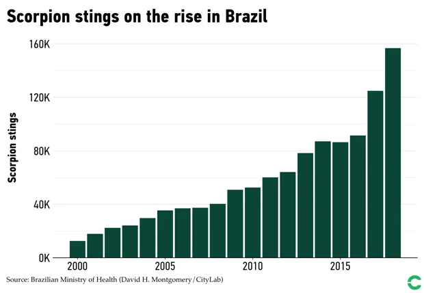 根据巴西卫生部,自本世纪初以来,巴西被黄蝎子蜇伤的人数激增了十倍以上,从2000年的12,000人增加到去年的156,000人。这些蜇伤可能导致癫痫发作、呕吐和剧烈疼痛。对于成年人来说,大多数并不致命,但幼儿非常脆弱。上个月一名7岁女孩在弗朗科·达·罗查被蝎子蜇伤后死亡,该地区属于圣保罗大都市区。这名女孩被转送到一家没有必要抗毒素的医院,并在当天晚些时候去世。