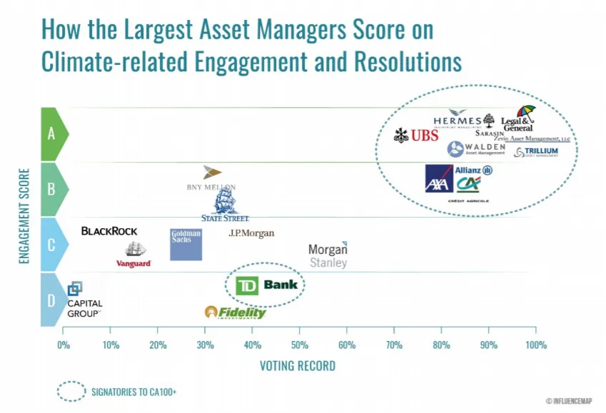 这一事件也揭示了一份新报告,资产管理者与气候变化,由位于伦敦的气候变化智库InfluenceMap发布。他们的分析发现,全球15家最大的投资机构在管理的资产总额达到37万亿美元,但它们在“巴黎协议”目标所需的分配上集体偏离,目标是阻止全球气温上升2度。实现这一目标主要需要从汽车制造商中撤资,同时对替代能源生产商进行大量投资。整体市场偏离18%;大型机构的偏离范围在15%到21%之间。
