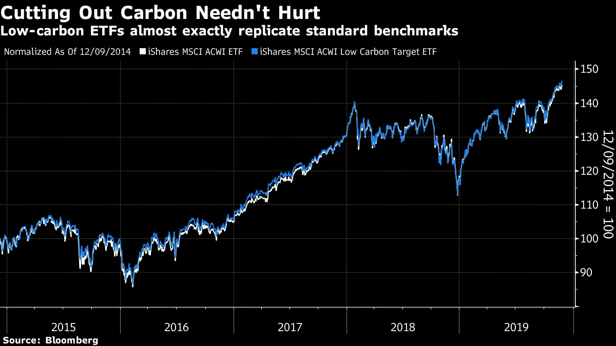 这张图表比较了两只交易所交易基金的表现。一只基于MSCI的全球所有国家ACWI指数,而另一只是该指数的低碳版本,声称将投资组合的碳排放减少77%。找出区别:
