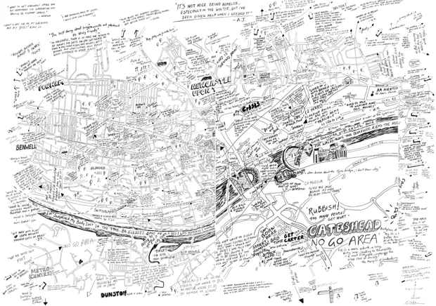 一个带有放大插图的反向地图,由“在关怀之城中成像无家可归者”项目制作,这是一个与30名单身无家可归者在英国纽卡斯尔进行的参与式制图项目,始于2014年。这不是一本地图集尽管如此,他认为反向制图的实践可以发挥至关重要的颠覆作用,尤其是在如今地图用于商业利益的情况急剧增加。“我们今天使用的许多地图都是为了消费的目的,无论是谷歌或脸书为你提供广告,优步为你寻找乘车或食物,还是Tinder为你寻找约会,”达尔顿说。“但反向地图是不同的。它们不是关于货币交换——而是关于社区中需要改变的事情。”