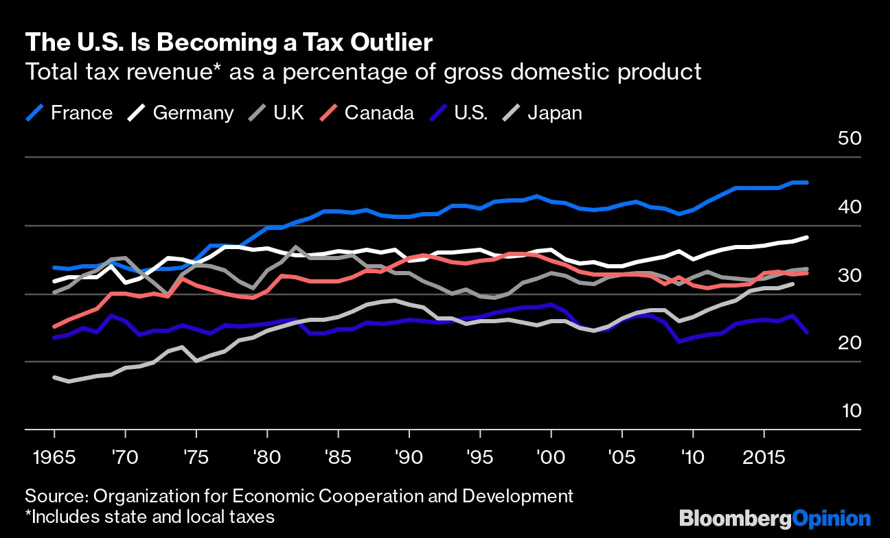 总统唐纳德·特朗普常常称美国是“世界上税收最高的国家。”在这一点上,与许多其他事情一样,特朗普与真相的关系是脆弱的。事实上,在发达经济体中,美国长期以来一直是税收最低的国家之一,贾斯廷·福克斯指出: