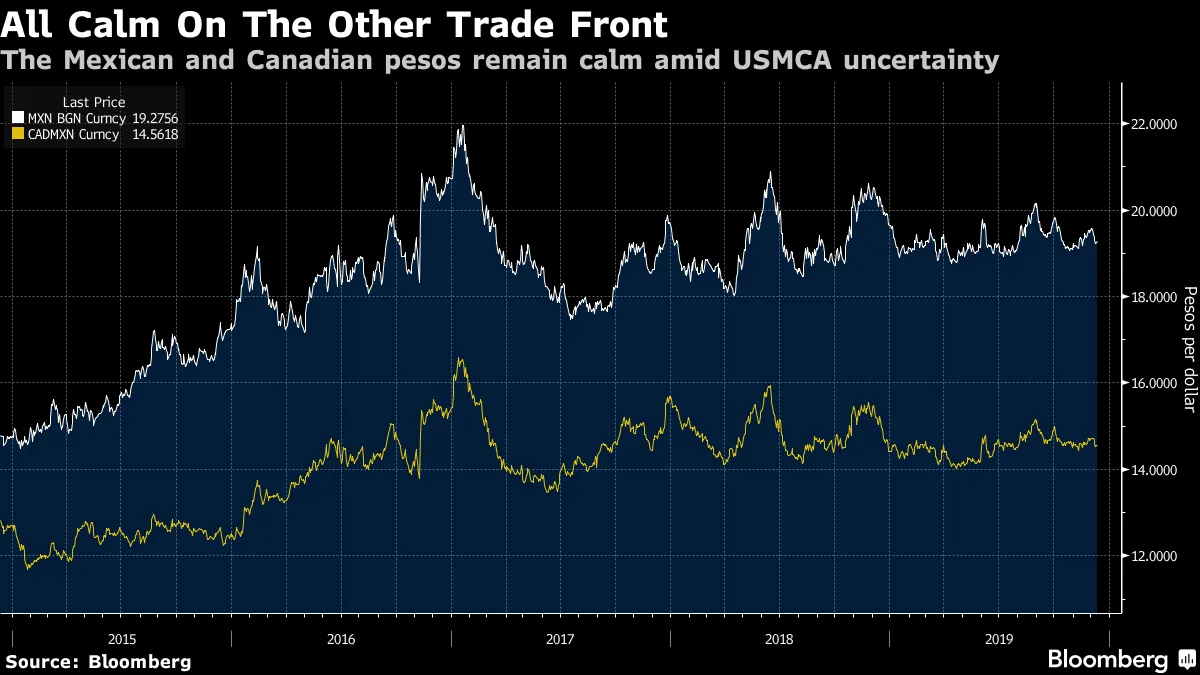 对于美国将在周日对中国商品征收关税的消息,确实引发了巨大的兴奋和不确定性。同时,市场似乎并没有将未能批准美墨加协定(USMCA)这一重新命名的贸易协议的风险计入价格,该协议涉及美国、墨西哥和加拿大。2016年唐纳德·特朗普当选和2018年左翼民粹主义者安德烈斯·曼努埃尔·洛佩斯·奥夫拉多尔当选时,墨西哥比索遭受了严重打击,这似乎预示着更加紧张的关系。
