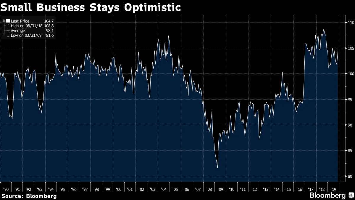 与此同时, 正如我昨天详细说明的, 对即将到来的衰退的恐惧在美国急剧下降。全国独立商业联合会的乐观指数最新版本确认,经营小公司的人的信心与三年前唐纳德·特朗普当选后的立即反应一样乐观: