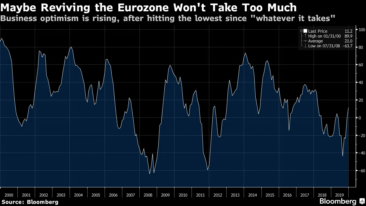 在欧洲,人们越来越相信底部已经到来。本周的ZEW欧元区商业乐观情绪调查显示,情绪出现了急剧回升,不久前刚刚触及自马里奥·德拉吉(拉加德的前任)著名表示“无论如何都要拯救欧元”以来的最低水平。随着商业乐观情绪的改善,拉加德有更多时间来理清她的战略——而拯救欧元区,现在看来,可能并不需要太多: