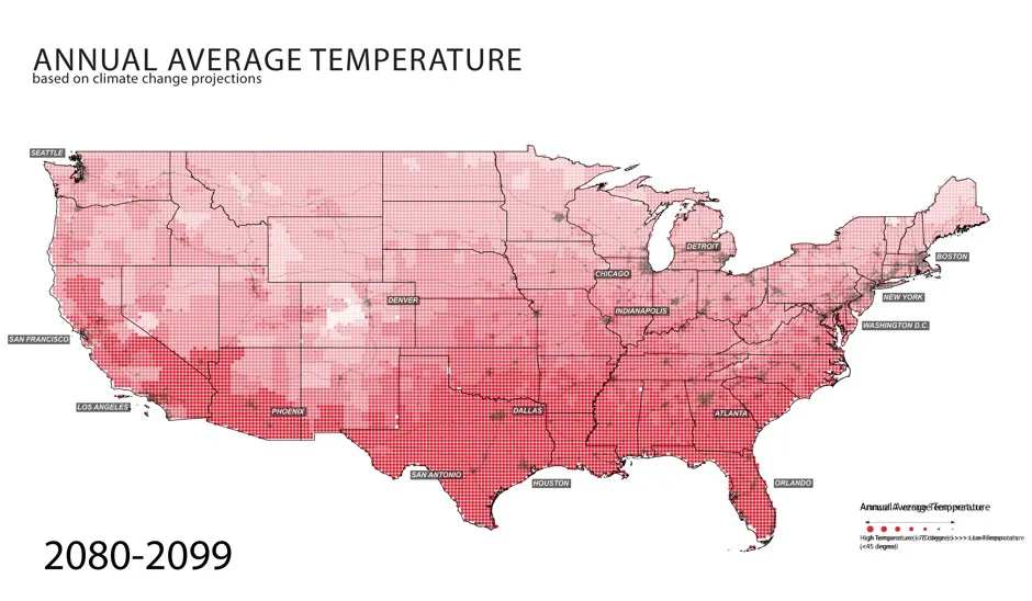 情况会变得多糟?《绿色新政地图集》描绘了一个既令人担忧又充满希望的画面。感谢 McHarg 中心在100年后,由气候变化转变的美国将是什么样子?在这一点上,你不需要太多想象就能预测未来:气温将继续上升;海平面将继续上升。而到2060年代,美国人口普查局估计,全球迁移模式将使1亿新移民进入这个国家,他们将从海岸到海岸定居。